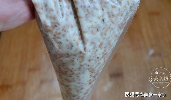 第七步:把面糊装在一个裱花袋里,没有的也可以用勺子,裱花袋尖头处剪开一个口。