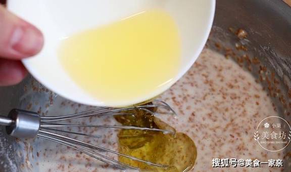 第五步:没有颗粒的时候,倒入120克玉米油,玉米油少量多次地添加进去。