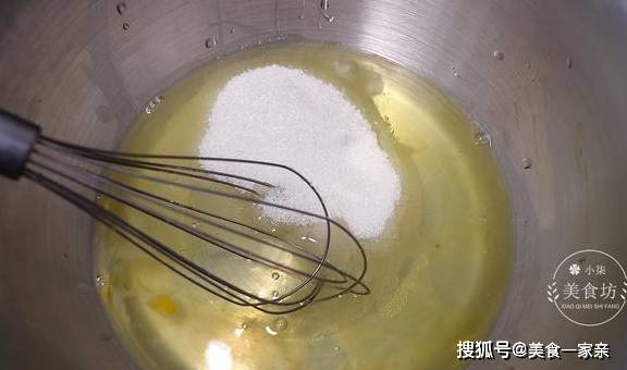 第二步:准备一个盆,把鸡蛋清打入盆里,蛋清的重量约为180克,蛋黄放一旁可以留着炒菜,然后再放入80克白糖,也可以根据自己的喜好添加白糖,然后用打蛋器充分搅拌均匀。