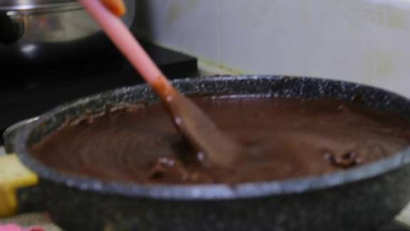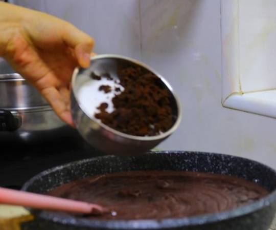 5.将打好的豆沙倒入不粘锅内,翻炒,这一步是炒去水分,