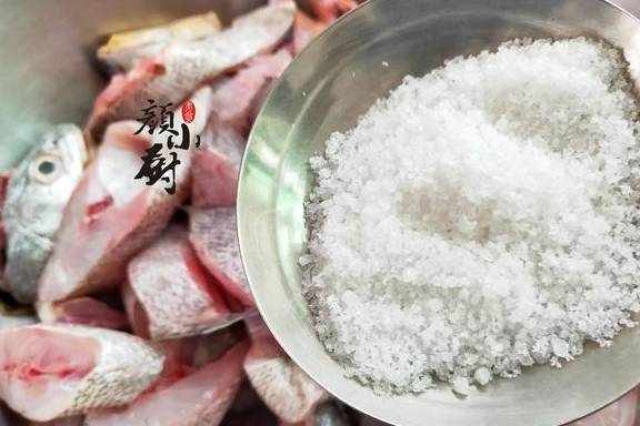 步骤三:把切成好的鱼块放入大盘中,按10斤鱼,加入100克的食用盐腌制,这个量味道是咸淡适中,不会咸又不会淡,然后两手抓着大盘两边来回抖动,让食用盐均匀地渗透到鱼肉里,抖均匀后腌制30分钟。