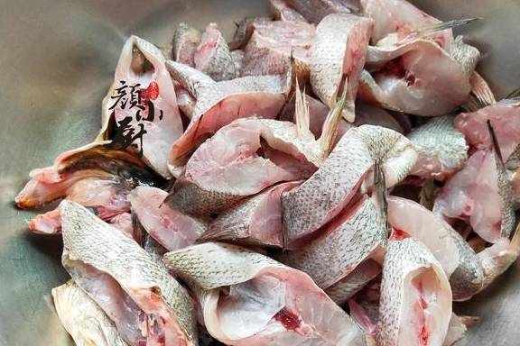 步骤二:用一把锋利的刀从鱼鳃处斜刀切一刀,鱼头对半切开,挖去鱼鳃和鱼的内脏,然后把鱼肉斜刀切成2厘米左右的鱼片,全部切好不要用水清洗,记住不要用清水清洗哦!这一步是关键,如果这个时候用清水洗了,鱼肉就不好看还不成形。