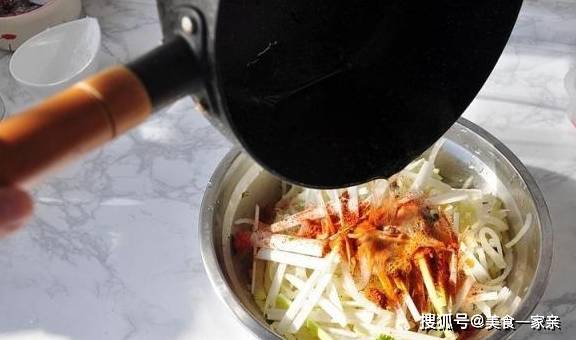 5将挤净水分的苤蓝丝放在盆中,放入葱丝、蒜末、辣椒面,然后将花椒凉油下锅,烧热油出香味,将烧热的花椒油浇在盆中。