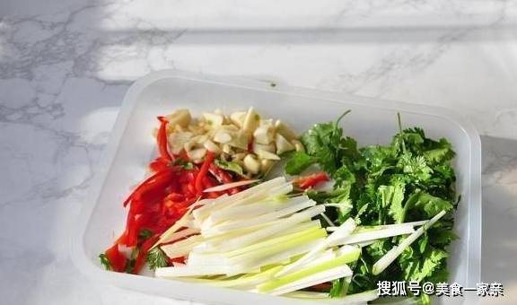4准备其它配料,香菜切段,葱切丝,红椒切丝,蒜拍碎。