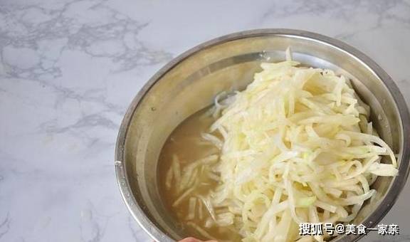 3将腌好的苤蓝丝挤净水分,然后用凉水反复漂洗,直到基本上尝不出咸味。