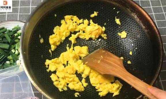 3、开火将锅烧热,倒入少量的油,油温七成热的时候,将鸡蛋充分搅拌后下锅翻炒,蛋饼成型后用铲子搅碎,颜色金黄后即可盛起备用