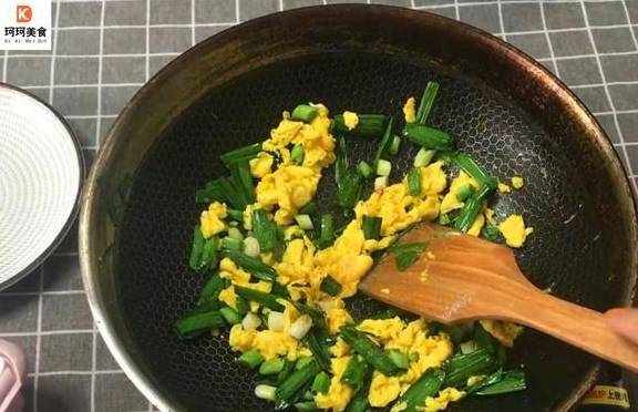 5、蒜苗翻炒几下即可,然后将炒好的鸡蛋下锅一起炒,加入食盐2克、调料1克,翻炒几下调料炒开即可出锅。
