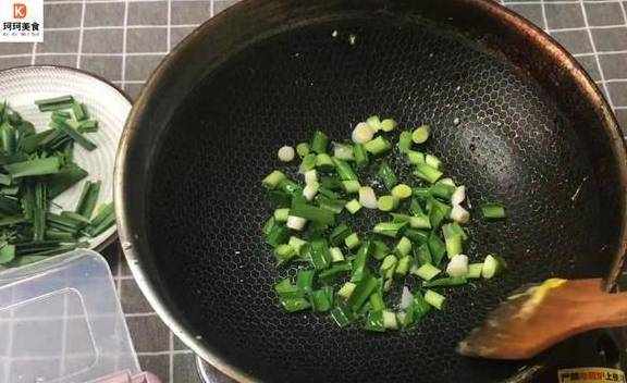 4、再次倒油,油温五成热的时候,先将切好的蒜苗头倒入锅中翻炒,蒜苗头不容易熟,先下锅还可以爆香,之后将叶子一并倒入锅中炒