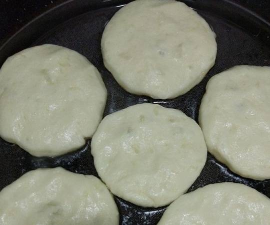 6.电饼铛加热,入油滑匀。取适量土豆泥面用手搓圆,再摁扁。逐个入电饼铛。