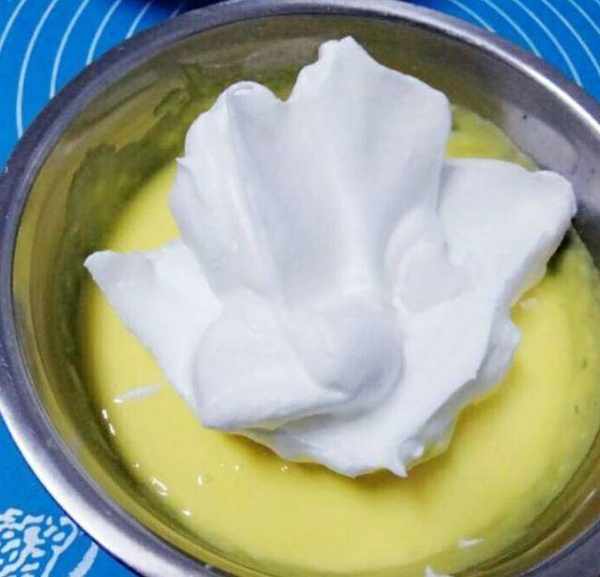 步骤六:将一半打发好的蛋清加入到蛋黄糊中搅拌均匀