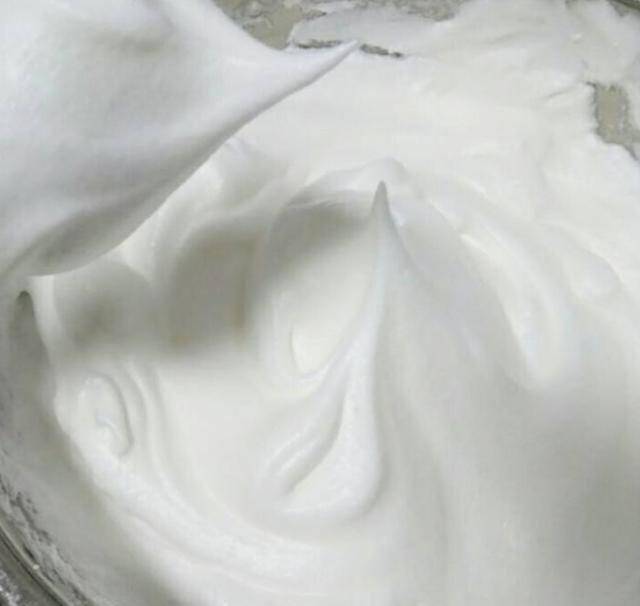 步骤五:蛋清中加入细砂糖,可分三次加入也可一次性加入,可以适当加几滴柠檬汁去除蛋清的腥味,用电动打蛋器打至干性泡发,如图所示