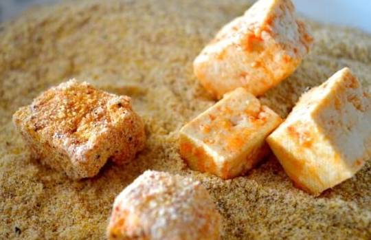 2.另取一个盘子,把玉米面、辣椒粉、孜然粉、盐、大蒜粉和胡椒粉混合均匀。然后把豆腐块分批放入盘中。