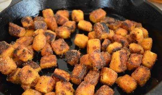 好吃的关键是豆腐的做法:将切块的豆腐裹上蜂蜜和辣椒,然后耐心地煎出脆皮。