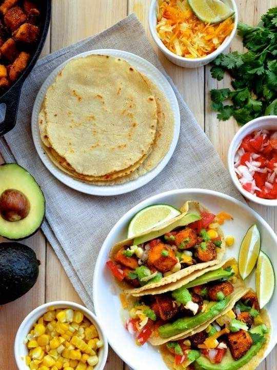 玉米饼可以参考我们之前的塔可做法,用北京烤鸭食谱中的自制面饼代替,也可以直接从超市购买。