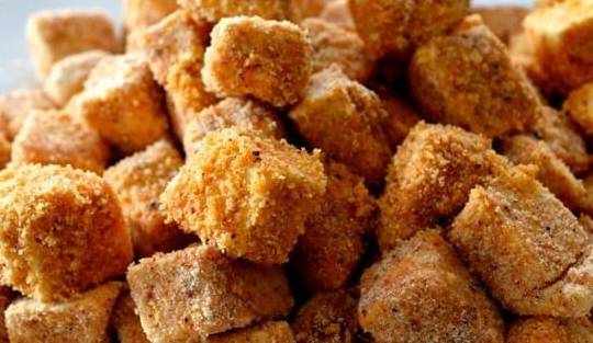 让豆腐块的每一面都裹满粉末。这样做能让豆腐块表皮在油煎时变得酥脆。