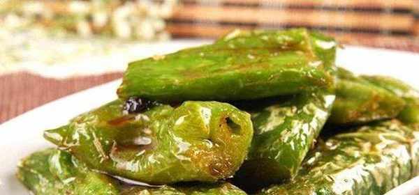 2、青椒去籽,用刀拍一下,切成小段,平底锅中放少许的油润锅,倒入青椒,把青椒煎至两面呈虎皮状,边煎边用勺子压一压。