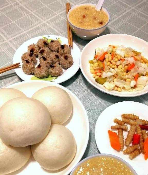 第二天的晚餐:蒸大白馒头,熬糯米小米枸杞粥,泡螺丝菜,泡莲花菜拌黄豆,蒸珍珠丸子。
