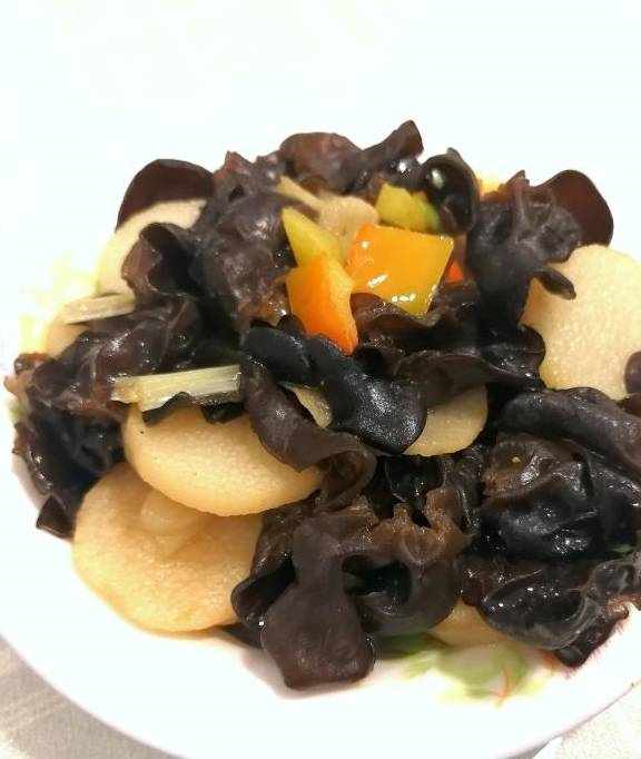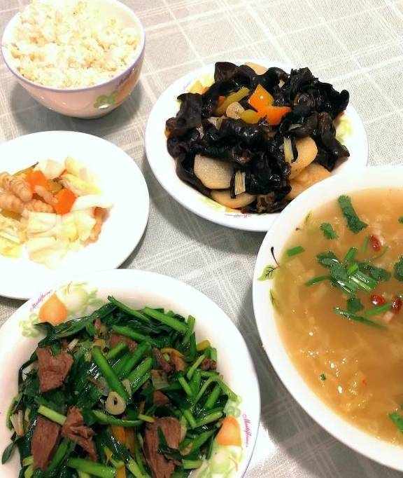 第五天的晚餐:牛肉炒韭菜,山药炒木耳,咸泡菜,红薯烧白菜汤,糙米和大米米饭。