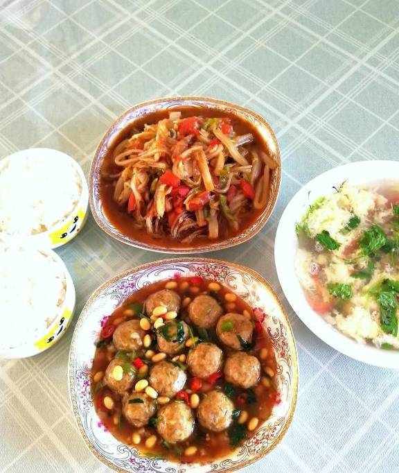 第三天的晚餐:烧丸子,炒大白菜,鸡蛋西红柿汤,大米黄米米饭。