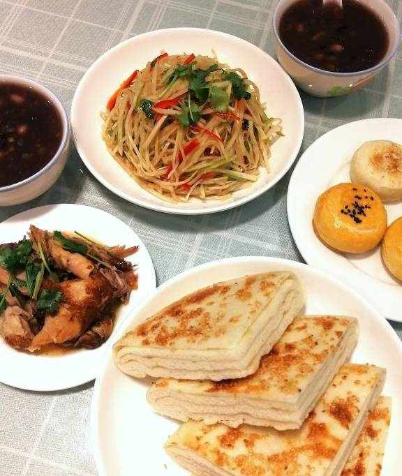 第一天的晚餐:烙香酥千层饼,红薯夹心点心,凉拌苤蓝丝,烧鸡肉,黑米黄豆小米大米粥。