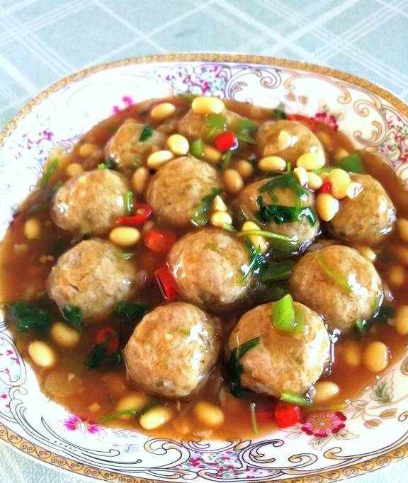 丸子是用猪肉和青萝卜蒸出来的,味道鲜美好吃,大白菜是用西红柿炒出来的。