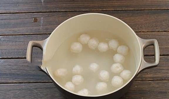 3.锅中加入足量的清水,大火烧至水温到70度左右,即可离火,双手沾上适量清水,用手取适量的鱼肉泥,然后从虎口将鱼肉泥挤出来,做成一个丸子,最后用勺子刮到锅中,依次做出足量的鱼肉丸;