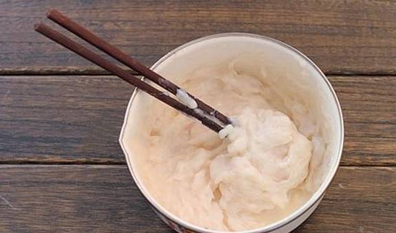 2.将切好的龙利鱼倒入料理机中,加入少许食盐和胡椒粉,通电后选择料理功能,将鱼肉打成均匀的鱼蓉(越细越好,这种做出的鱼丸口感细腻),将打好的鱼蓉倒入空碗中,加入适量的淀粉和一点点清水,然后用筷子朝一个方向快速搅拌,直至碗中鱼肉泥搅上劲,能挂在筷子上不掉下来即可(这个步骤很重要,一定要多搅一会,确保做出的鱼丸紧实弹牙,更有嚼劲);