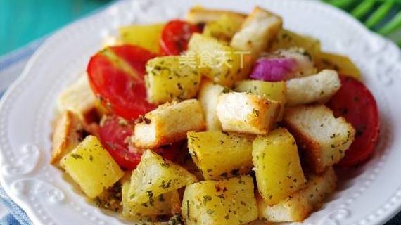 蒜香吐司块的做法步骤:1备好食材:吐司、土豆、圣女果;