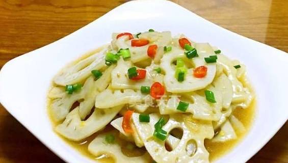 糖醋藕片的做法步骤:8出锅前加入葱花即可!
