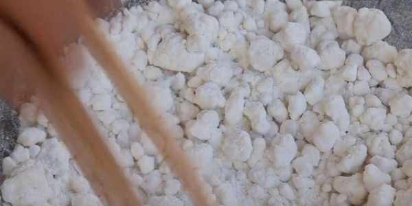 3.接着少量多次地加入粉中,一边倒一边搅拌,搅拌成大颗粒状。