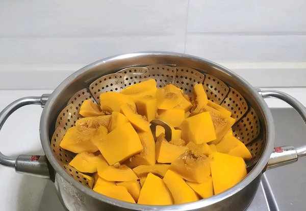 1.首先准备南瓜500克去掉外皮,然后给他切成一厘米左右的薄片。把准备好的南瓜直接开水上锅蒸五分钟。用筷子轻松的能插透就代表南瓜已经蒸好了。