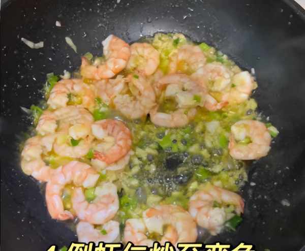 第五步:锅底加上少许食用油,加上一些葱花和蒜末,快速爆炒出香味来,倒入腌制好的虾仁,将虾仁炒至变色。
