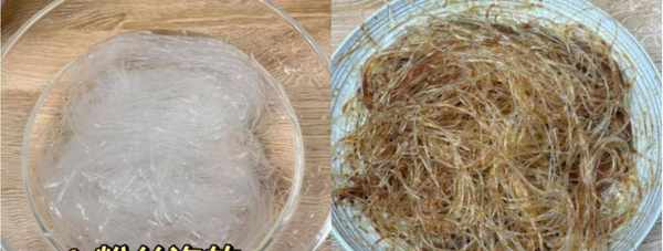 第二步:将泡好的粉丝放在碗中,加上半勺老抽,加上少许食用油,用筷子搅拌均匀,将粉丝上色,备用。
