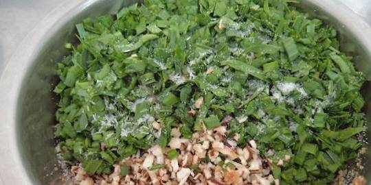 5.将韭菜、香菇切碎与搅拌好的猪肉馅放在一起,加芝麻油、盐、味精搅拌均匀成饺子馅