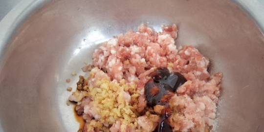 4.猪肉馅中加姜末、盐、味精、生抽、蚝油、胡椒粉顺一个方向搅拌