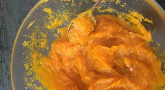 2.南瓜块蒸熟之后把南瓜皮去掉,把南瓜肉用勺子压碎,同时加入白糖