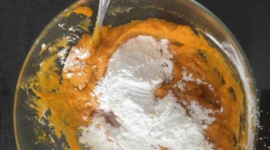 3.趁热在南瓜肉里先加入糯米粉,等搅拌均匀之后再加入面粉