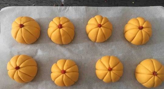 7.揉光滑之后,用牙签在南瓜面团上压米字花痕,在中间用枸杞装饰