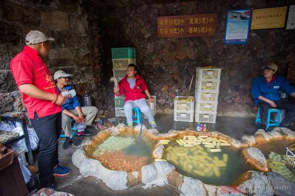 在聚龙温泉的下方有间小木屋,为半敞开式的,屋内有几个温泉池,不停地冒着热气,看得出温度不低。池内有一些鸡蛋、鸭蛋、玉米什么的,池边有两名工作人员不停地在捞鸡蛋。由于购买的人源源不断,他们的整个过程就如同流水线一般。而这就是长山白著名的温泉鸡蛋。