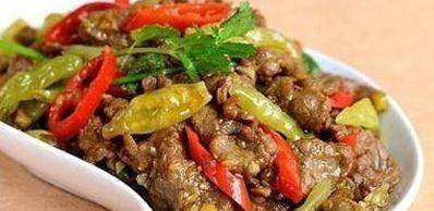 3、锅内倒入食用油,将羊肉片(丝)、青椒丝、红椒丝,一并倒入锅中过一下油,捞出