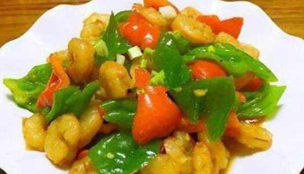 2、大火放入青红椒略炒后加盐,之后加入虾仁翻炒几分钟,出锅了。