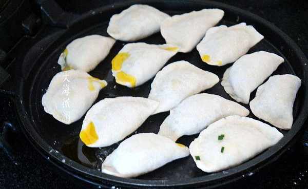 电饼铛刷底油,码入包好的大饺子,上边也刷油,然后盖上上盖,上下火中温慢慢地煎。