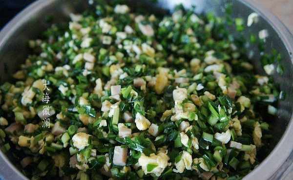 2、韭菜切碎后,一定要拌点色拉油锁住水分,再拌馅时才不会出水。