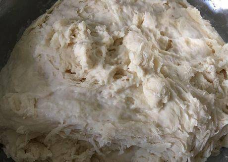 第四步,发好的面团移至案板,加上黄油和盐,再次揉匀后,醒发20分钟,再将其擀成面饼;