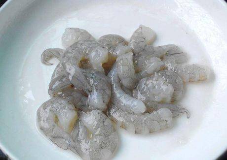 第七步,鲜虾去头、去壳、去虾线,清洗干净后,加上奥尔良烤肉料,搅拌均匀入味,同时将青红椒清洗干净切圈;