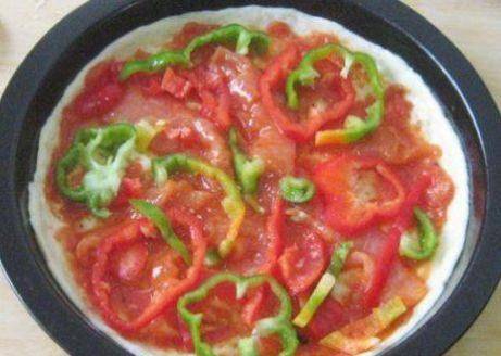 第八步,在饼皮上涂一层披萨酱,放上腌制好的里脊肉,摆上青红椒圈,撒上马苏里拉芝士;