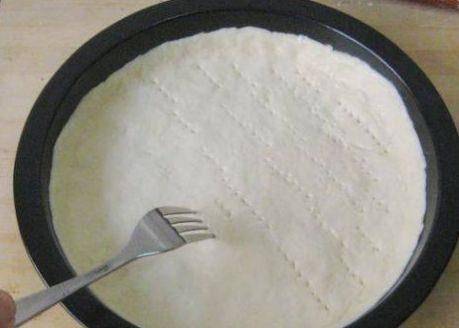 第五步,在披萨烤盘中,刷上些油,放入做好的面饼,弄得平整一些,用叉子在上面叉些小孔;