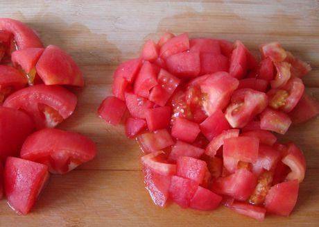 制作过程:第一步,首先我们来做披萨酱,将番茄清洗干净后,放在开水中焯烫一下,去皮后,切成小块;