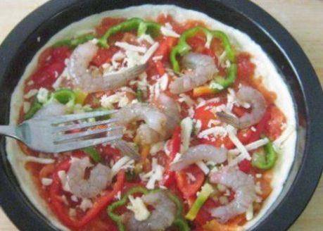 第九步,再把虾仁放上,撒些芝士,最后撒上披萨草,烤箱200度预热5分钟,放入烤盘,20分钟,烤好前5分钟,再撒些芝士,烤5分钟即可。
