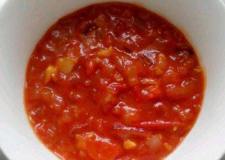 第二步,锅中添上油,待油热后,放入蒜末煸炒香后,放入番茄,煸炒片刻,加上糖、盐、生抽、胡椒粉,炒制汁变稠的时候,即可关火,成披萨酱;